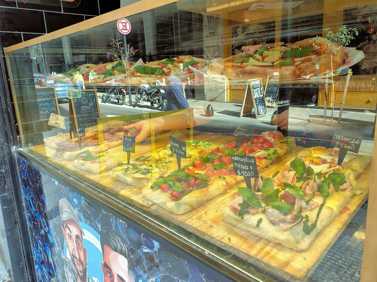 About two years ago, a Neapolitan style pizzeria called Furore opened up in the downtown area. I haven’t yet been, but headed that way recently. I’d seen that they’d started offering Roman style pizzas about two months ago. Specifically the square in teglia, or in Spanish, al taglio style. What I didn’t realize was that it’s two different locations, a block apart. So I found myself at the latter spot, Furore al taglio, Maipú 494. It’s primarily just a takeout stand, but they have a small counter along the wall where three people can squeeze in and nibble their wares.