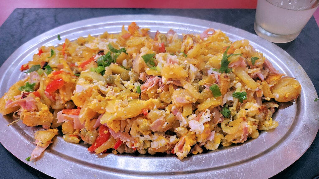 So, on to a trio I've tried recently! I'm going to start with what I'd assert is the most common version seen in bodegones. It's mostly french fries, somewhat broken up by the scrambling process, and not crispy - often a bit oil soaked. Basically they're stir-fried with a little bit of egg, just enough to kind of coat them with bits, and then canned peas and roasted peppers are tossed into the mix. You can find this version at probably 3/4 of the bodegones in the city, and most of the remaining quarter simply don't offer the dish.