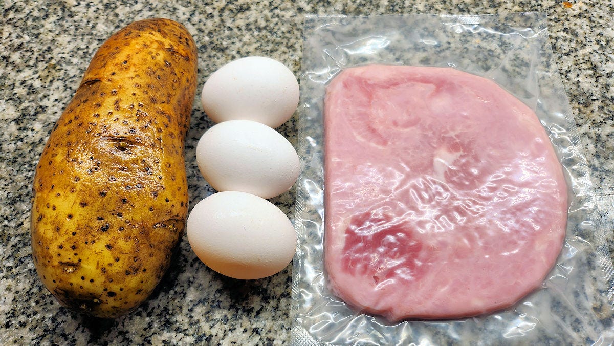 The gospel for the recipe is a simple scramble of eggs - never whisked, just moved around in the pan so that you have streaks of white and yellow. Seasoned with salt and a small amount of pepper, and with a julienne of cooked ham. On the side, never mixed in, and never on top, should be papas pays, or, crispy shoestring potatoes, lightly salted. And that's it. Now, one caveat occurs to me. These days everyone, including the place that does it "right" uses thin sliced lunchmeat ham. But packaged, thin sliced ham of that sort didn't exist in the mid 1800s, so it's more likely that this was made from a julienne of an actual cooked leg of ham rather than the bright pink stuff we're so used to. Even if they'd used deli type ham, which did exist, it still would have been different. I'd like to see someone make this dish using high quality ham in the mix rather than supermarket cold-cuts.