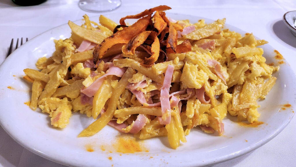 Interestingly, I was watching an interview with Alejandro Maglione, the former "president" of the Grupo Gramajo, and a well known gastronomic journalist. He passed away about two years ago. The interview was held at El Globo, Av. Hipólito Yrigoyen 1199, Monserrat. He and the interviewer were having coffee and chatting about the dish. When it was proposed that they try the dish during the interview he more or less waved off the idea, and the interviewer later came back and did a whole "in the kitchen" video segment and then trying the dish. For a purist, this one just wouldn't fit the bill - again, french fries instead of shoestrings, not crispy, tossed with the egg and ham - and the egg has clearly been whisked, since it's all evenly colored. No additions are made, unless you call a few also not crispy strips of fried sweet potato atop an addition. To their credit, the dish is well seasoned with salt, though I like a bit more pepper than they put on it, and more was provided. This one is an easy portion for two, and comes in at 9700 pesos, or just a touch over $7.