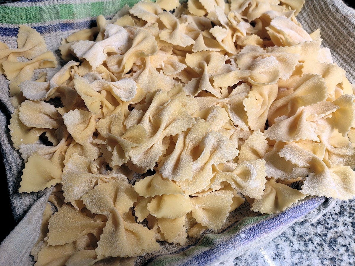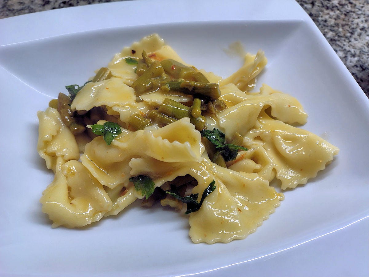 It was a simple enough dish, a plate of steamed asparagus in a verjus and colatura di alici beurre blanc. But the use of verjus, essentially a grape juice made from unripe grapes, so it’s very acidic, and the colatura, the Italian version of fish sauce, sounded intriguing. This one didn’t take a lot of experimenting - I know how to make a beurre blanc, and subbing in the verjus for lemon juice and adding just enough colatura di alici to give it a good umami hit was pretty easy. I turned it into a pasta, with our homemade farfalle. After trying it, I wanted to spike it up a bit, and some playing around led to finally using a bit of our sun-dried tomato salsa macha in the mix as well, finishing cooking the asparagus in the sauce, and adding in some whole parsley leaves at the end to wilt into the dish.