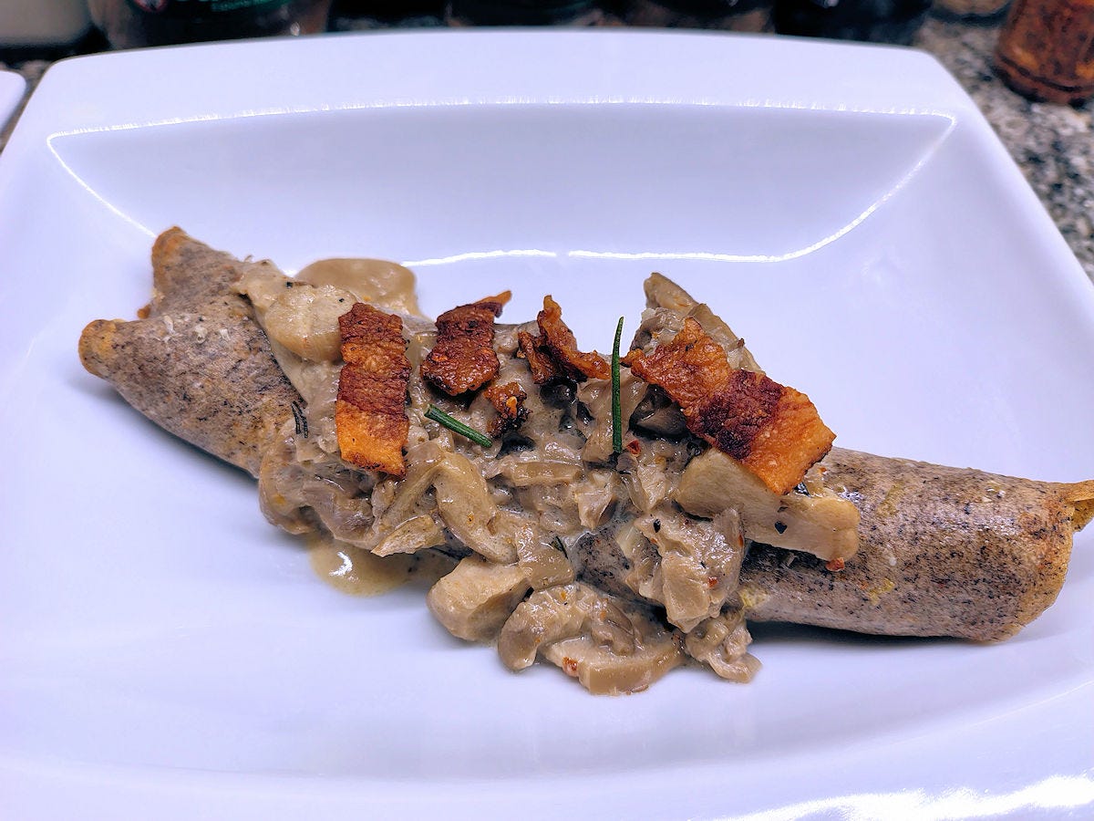 I won’t go into the long series of playing around with the dish that eventually led to buckwheat cannelloni filled with a smoked mozzarella, ricotta, and caramelized onion filling, and topped with a sauté of oyster mushrooms sautéed with garlic, rosemary, merquén (smoked chili blend), finished with cream and crispy guanciale and a grating of parmesan and lemon zest. But that’s where we ended up. Very happily.