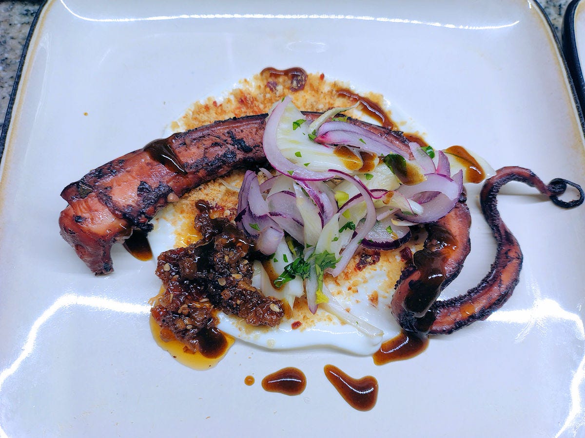 This one wasn’t an IG inspiration, but something I’ve been working on for a long time. I just couldn’t get the flavor balance the way I wanted it. But slowly, it came together. The base, salted yogurt, topped with a crumble of serrano ham and panko toasted together; over that, an olive oil confited tentacle of jibia, the Humboldt squid, our house rocoto chili crisp, a little salad or red onion, fennel, and cilantro dressed with lime juice and salt; and finished with a lightly sweet lucuma (a Peruvian fruit) infused molasses (I picked up some lucuma extract while in Lima earlier this year). This one will definitely make a return visit.