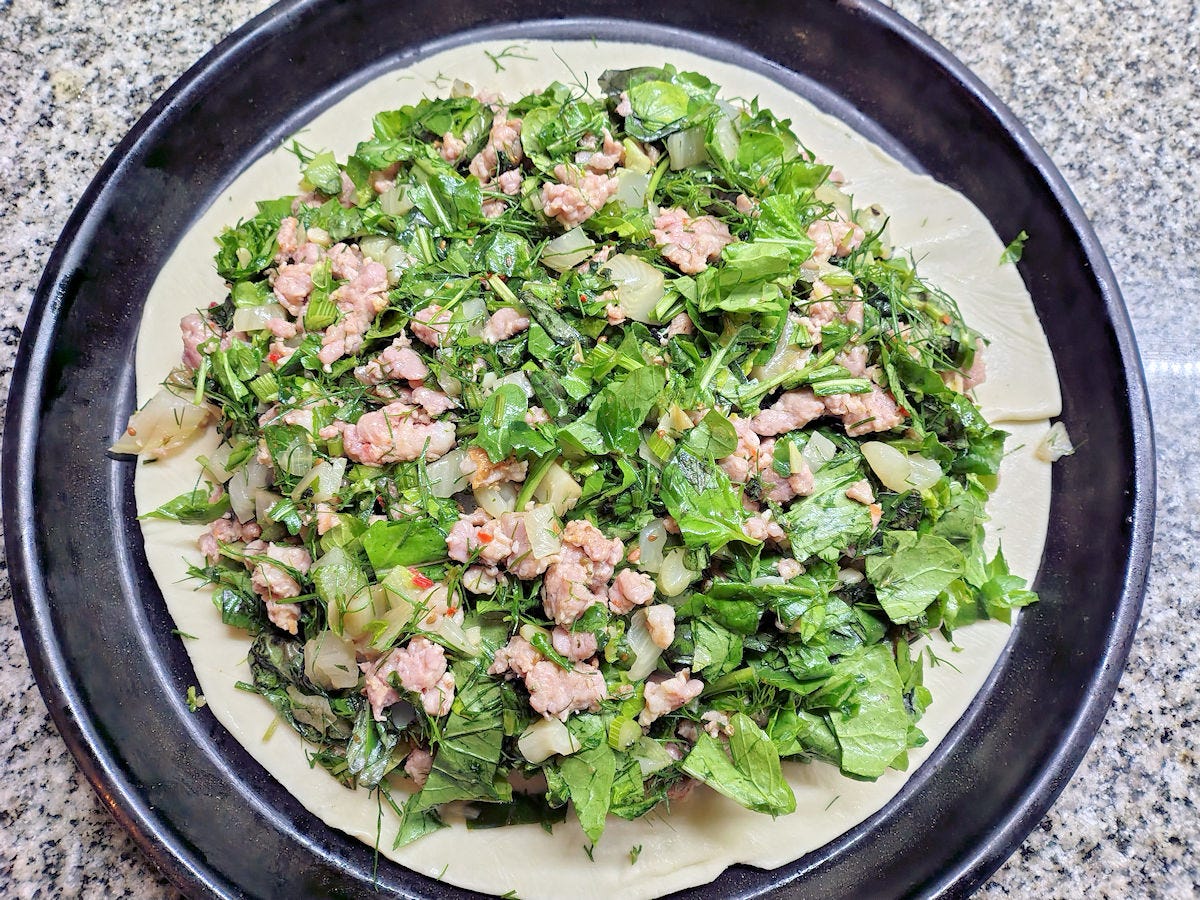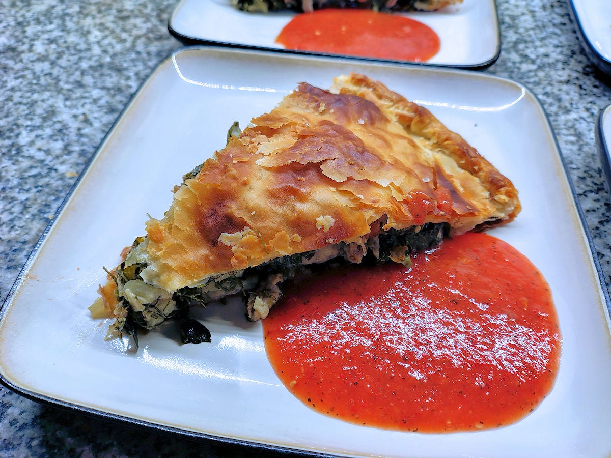 I’ve been giving each lunch a sort of base theme of a particular region in the world, and for this lunch, it was Lucania, or, in modern day, Basilicata, in southern Italy. Along with a very interesting semolina based focaccia called strazzata, and a main course with a lucana style pork medallion smothered in garlic, served with a local whole wheat pasta called lagane, we started the meal with a take on a torta salata di verdure - a savory vegetable tart.