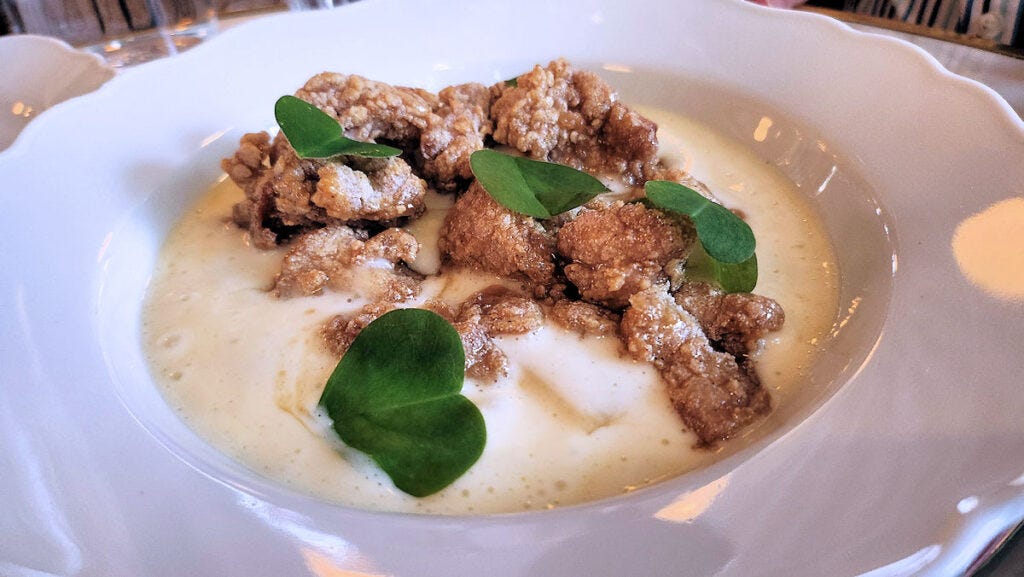 Supposedly the "it" bistro of the moment, Libertine, 684 Greenwich Street, West Village, didn't seem to be exactly overflowing with people. It was busy, mind you, but never full, despite being "the hardest reservation to get in New York" according to more than one person who mentioned it. My friend John, who booked us in for a delightful eve, apparently nearly hovered over his keyboard waiting for a table to open. My fave dish of the evening, the crispy fried sweetbreads in a butter sauce with white asparagus and sorrel leaves.