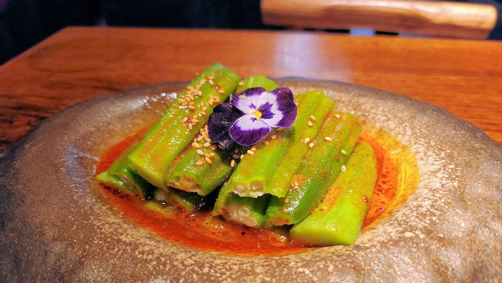 The huge okra, cooked tender, no sliminess, served chilled and bathed in a moderately spicy chili oil as a salad at Szechuan Mountain House, 23 St. Marks Place, East Village. Based on what else I ate and saw people eating, this is THE place in Manhattan to be going if you like Szechuan food. You'd think, given its location, it'd be a dive, but it's elegant, exquisite, and the food is ridiculously good.