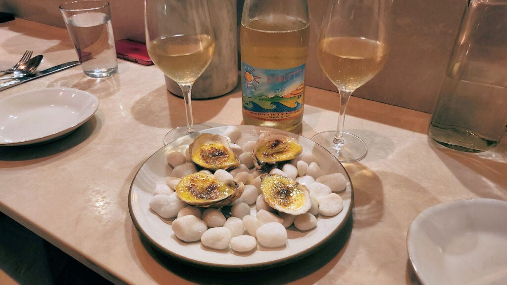 I don't really get the claim that Dame, 87 MacDougal Street, West Village, is a restaurant serving English pub food. Sure they have fish and chips on the menu, but nothing else that friend Kym and I had over a multicourse extravaganza screamed out English pub food. The star of the evening for me were the broiled oysters glazed with a chartreuse infused hollandaise sauce. Plus, a white wine from Banyuls, France - I'm not sure I even knew there was such a thing, at least not with the appellation. Does any of that sound like an English pub? Oh, and shout out of thanks to chef Michael Ruhlman for the recommendation!