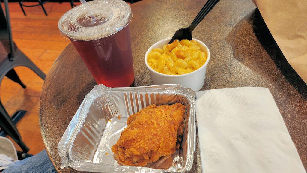 In various surveys that have apparently been performed, likely without any real controls on them, several places seem to repeatedly get to the top of the "best fried chicken in New York City" lists. One that regularly appears, and often in first place, is Bobwhite Counter, 94 Av. C, East Village. It was... good fried chicken. But if that's the best NYC can do... calling all really good fried chicken chefs, there's a market for you here. Plus, no one who says they're from the south offers "unsweetened" ice tea. It's "unsweet", and you know it.