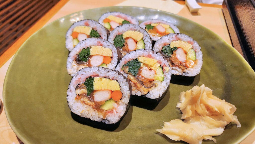 My friend Michael, sake guru to the stars and the little people alike, suggested lunch at what I guess was the first Japanese restaurant ever opened in New York City (or maybe just the oldest one still extant?), Nippon, 155 E. 52nd Street, right near to Grand Central Station. While I enjoyed another ten zaru soba, and he a bento box, the star on the table was this eel futomaki.