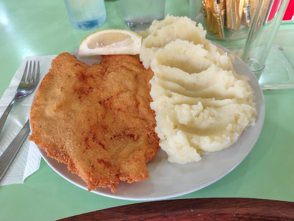 This one got on my list when local foodie friend Vanessa Bell wrote up her list of favorite cheap and cheerful spots to grab a bite. I happened to be passing by La Tayuela, Rodriguez Peña 110 in San Nicolás, saw it, remembered it, did a quick search to find the article, plopped down at the counter (there’s a lunch counter with ten stools, and then outside on the sidewalk, a couple of tables for two), and ordered up her recommended milanesa. She offered that either the beef or chicken were both solid, I went with the latter. It’s… fine. A bit overcooked and dry, and unseasoned, but salt, pepper, and lemon are provided, and the mashed potatoes are actually pretty good. Given that it, a bottle of water, and tip came in at a mere 11000 pesos, I’ll at least give it cheap and cheerful. I would say that the beef milanesa and the option for a fresh tomato salad, that the “regular” next to me, was wolfing down, looked more interesting. Might just go back and try that one.