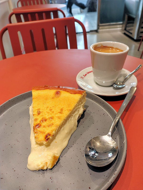 Recently, a “Basque cheesecake shop” opened up here in the neighborhood. I actually hadn’t realized that Joaquin Vasco Tartas, Peña 2326, was a café as well as store. They offer half a dozen flavors of cheesecake. Decent espresso. The cheesecake is delicious, though for me a bit underbaked - you can see it oozing its way onto the plate. You want it soft and custardy, but it ought to be a little more set than that. Pricey for a café (11400 pesos), but then, it’s a cheesecake, not a medialuna - a lot more work, and you can’t do up a hundred portions all in one batch. And you’d pay more at, say, a Starbucks for coffee and cheesecake and it wouldn’t be near this good.