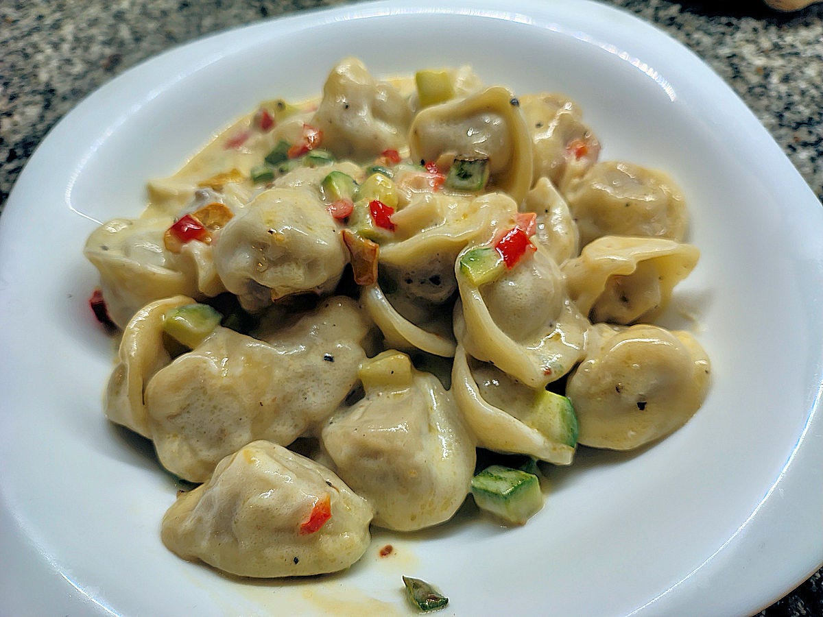 Let’s start with a little shopping. Avoska, Av. Hipólito Yrigoyen 2000, in Once, is THE go-to store for Russian products. Mostly homemade stuff from members of the local Russian community, you can find fresh and frozen dumplings of various types, salads, condiments, beverages, and more. For those of us who like to cook, this is the only place in town that I know of that sells real, cultured, sour cream (you do have to use it relatively quickly, as it has no preservatives and past experience suggests you have about a week until it starts to grow fuzzy blue-green stuff). From my last visit - a plate of beef pelmeni, boiled up and tossed with sautéed veggies and sour cream.