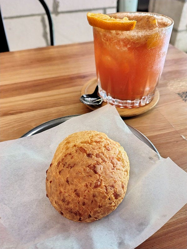 This one is just outside my originally defined “comfort zone”, but only by a block, and it looked really good. Cute space at Café Gutierrez, Juan María Gutiérrez 2637. But that’s about where that ended. Service was inattentive - I sat there for more than five minutes before someone bothered to come over - one of the counter staff was busy looking at his phone, another was busy drying some glassware, and a third, who I didn’t see until a little later, when he wandered in yawning, was apparently taking a nap in the back. The owners were there, as one of them finally waved at the one on his phone and pointed at me. It then turned out he had no idea how to “make” an iced coffee, and shouted instructions from the owners’ table walked him through it. It wasn’t worth bothering with - a watery coffee over too much ice, doused with a blanket of powdered cinnamon and a piece of an orange - and a chipa that was probably made 2-3 days prior. Pass.