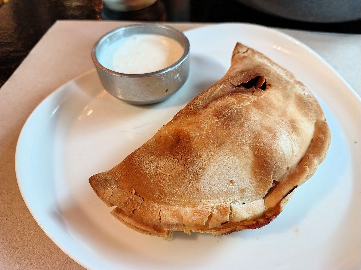 Weird crust on the lamb empanada - very thin, and it kind of falls apart, it’s almost like a flatbread that’s been dual-purposed. The filling is delicious, as is the aioli that accompanies it. 4200 pesos. A trifle steep for an empanada, but then, it is lamb. But then, the beef one is 4000.