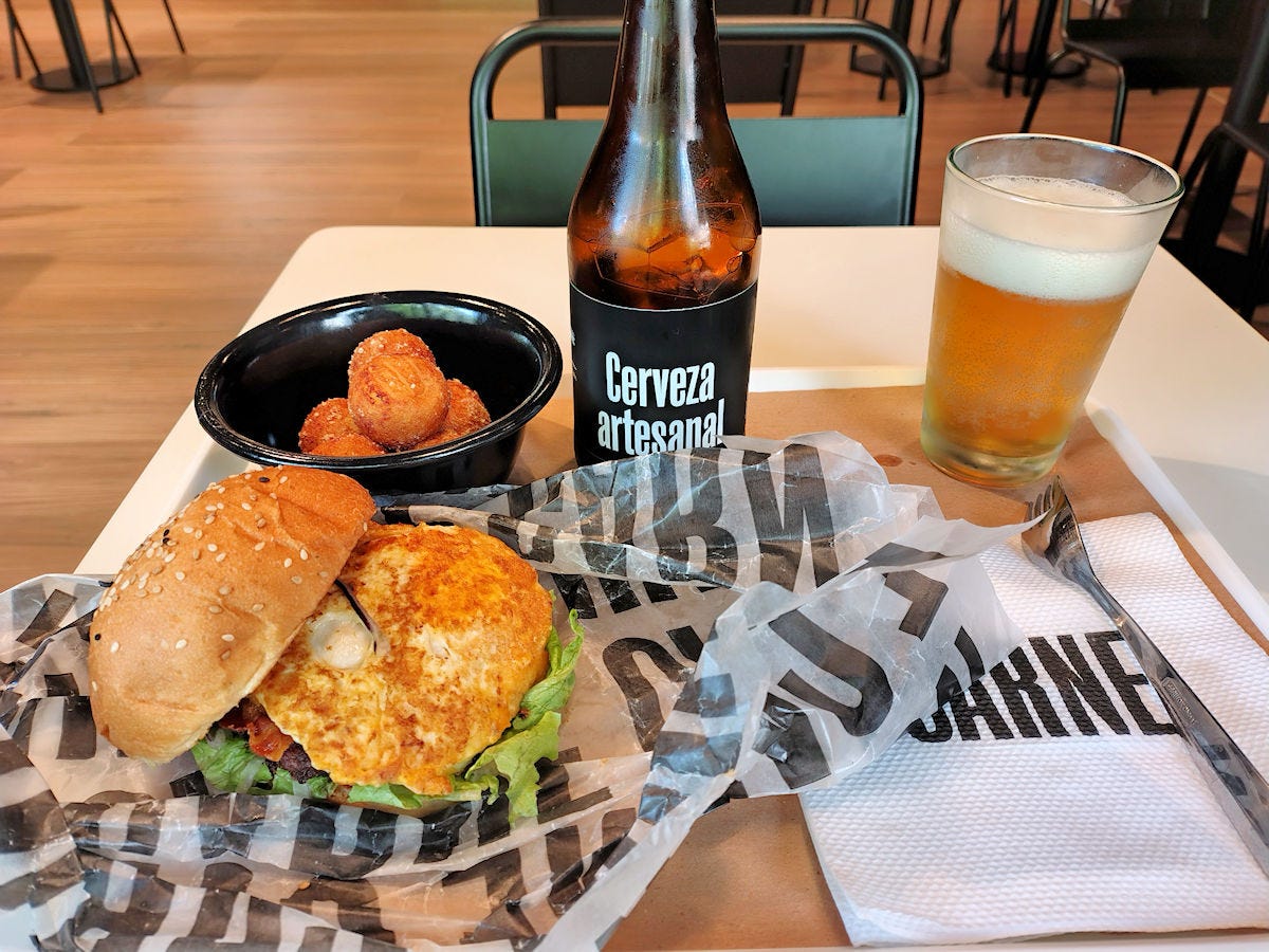 Their Completa burger, my longtime go-to - bacon, egg, cheddar, pickles, tomato, lettuce, red onion. Still cooked a bit more than I prefer, and with no option to change that, though it still comes out delicious. Cheese filled fried potato balls, and their own beer. Happy to have it in the ‘hood, and to finally have a really good burger that doesn’t break the bank.