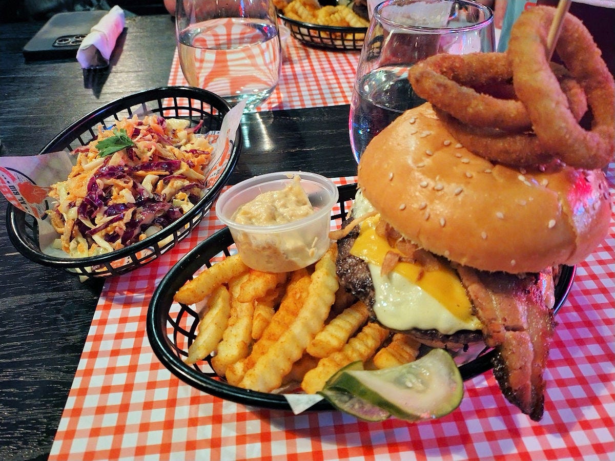 It’s a thin, chewy, overcooked patty of smoked brisket that in no world of measurement approaches the claimed 180gm (over 6 ounces) - it looks to be no more than about 3-4 ounces. And it has no smoke flavor at all. It’s topped with a wad of melted cheeses, a couple of rashers of slightly burnt bacon, and their special sauce. The commercial hamburger bun does not resemble the “cloud bread” claimed on the menu, and one might be forgiven for thinking that the “crispy onions” topping on the burger wasn’t just a trio of onion rings pegged to the top. The fries are bland and blond. The coleslaw might have been the best thing on the table - and it wasn’t one I’d want to eat again. Complete pass. 19900 for the burger and fries, 6900 for the slaw, 6500 for a beer.