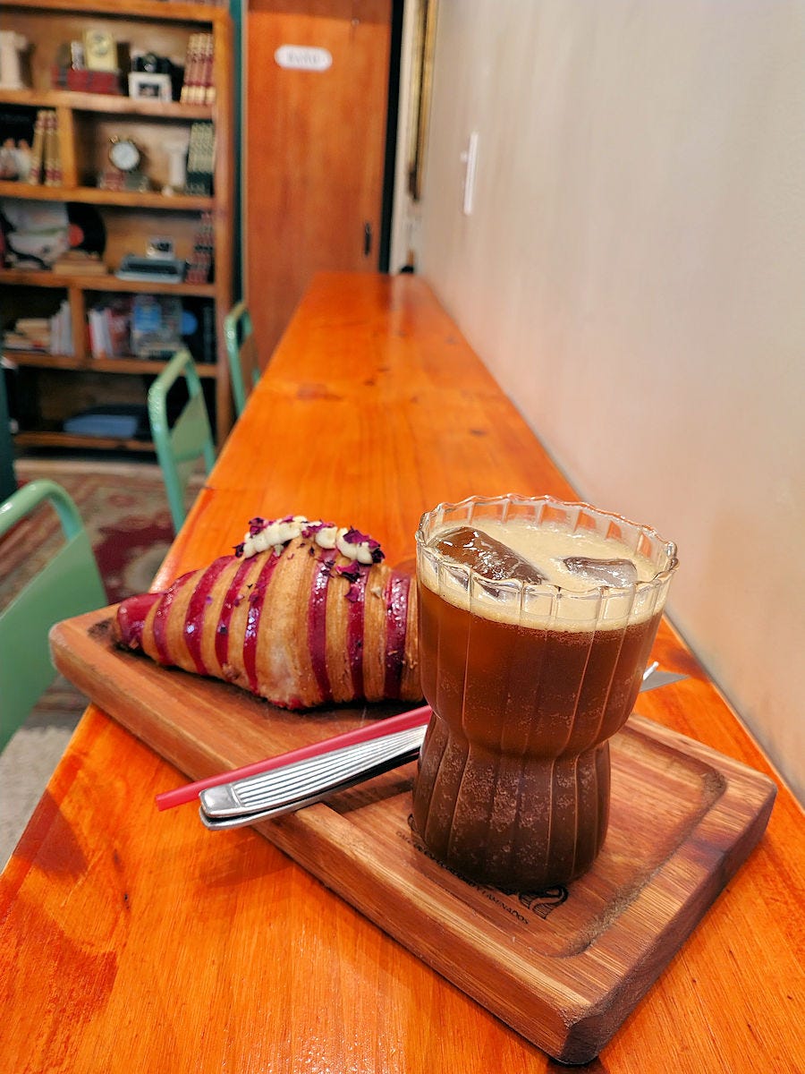 Vibra Café, Arenales 2434, Recoleta - Continuing to fill in the few neighborhood cafés I haven’t gotten to - the original start of this quest here - another new one that’s opened in the last couple of months. Tiny spot - just four seats along a shelf inside, and a couple of small tables on the sidewalk. Good iced coffee. Fantastic stuffed croissants.