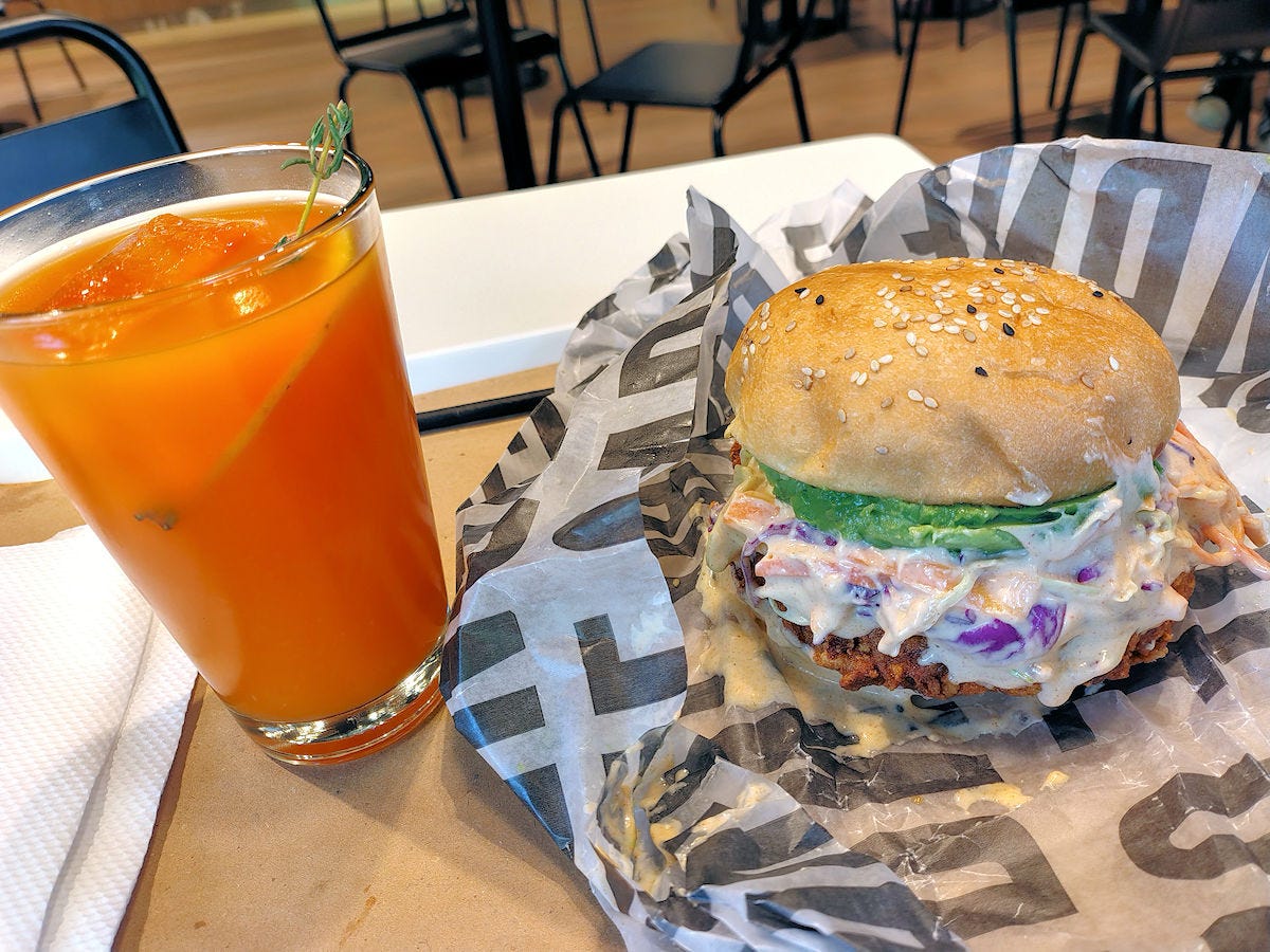 That said, I had never tried their fried chicken sandwich before, and thought I’d give it a whirl. Honestly, better than their burgers. A thick, juicy chicken breast, breaded and fried, topped with a sour cream style coleslaw, half an avocado, and just absolutely fantastic. They’re also offering fresh juices now - this is their orange-carrot juice. Perfect match with the fried chicken sandwich.