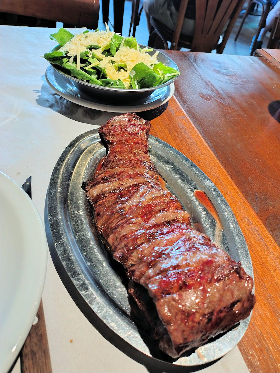 This one, given that it was about 18” long (it’s doubled over on that plate), was probably skirt steak. Regardless, it was one of the better cooked (perfect medium rare), well seasoned steaks that I’ve had in this neighborhood. Recoleta has always had steakhouses, but none that I’ve ever felt was really that good. Mostly just adequate. So this is a nice addition. 31000 pesos, plus a side salad of arugula and parmesan, a local classic, 10000 pesos.