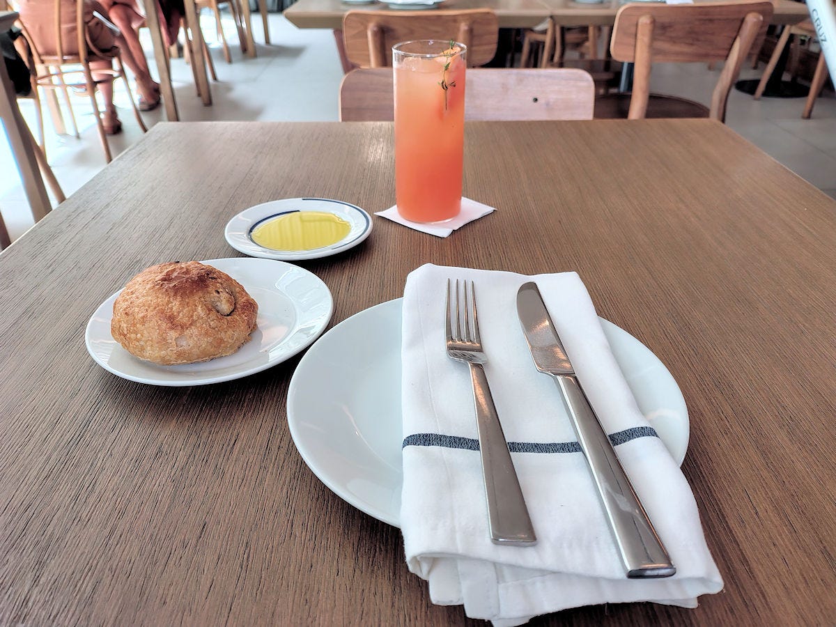 Excellent bread, hot and with a crunchy outside, good olive oil, and an excellent pomelada (fresh squeezed grapefruit juice, with thyme added). 6000 pesos.