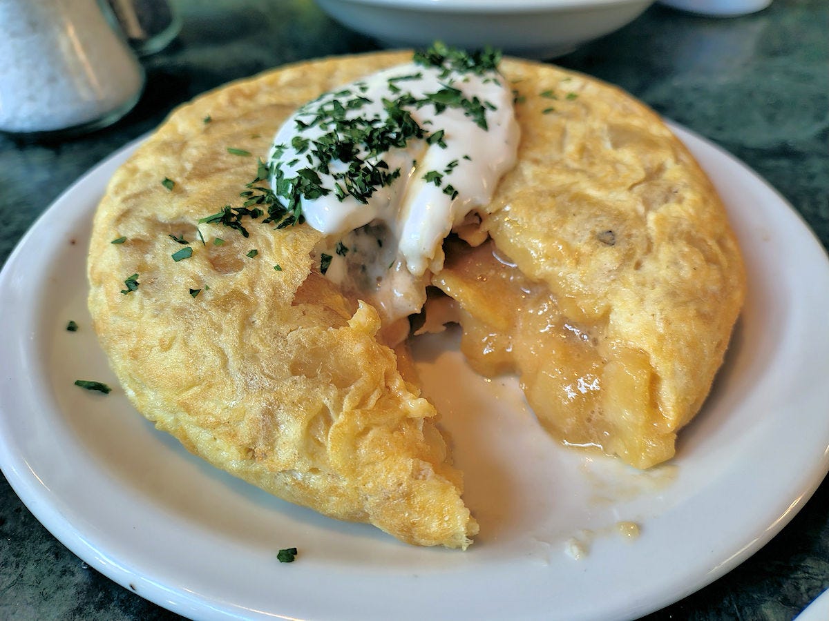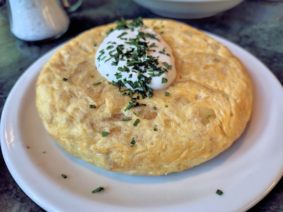 On to the main event, the tortilla. Perfectly cooked, properly babé (eggs just barely starting to set so it has a sort of gel-like texture), and a nice scoop of sour cream atop. It was good, but the lack of using salt in it was noticeable. Seriously, put a good pinch of salt into the mix and I’d grant it as being one of the best in town. 23000 pesos.