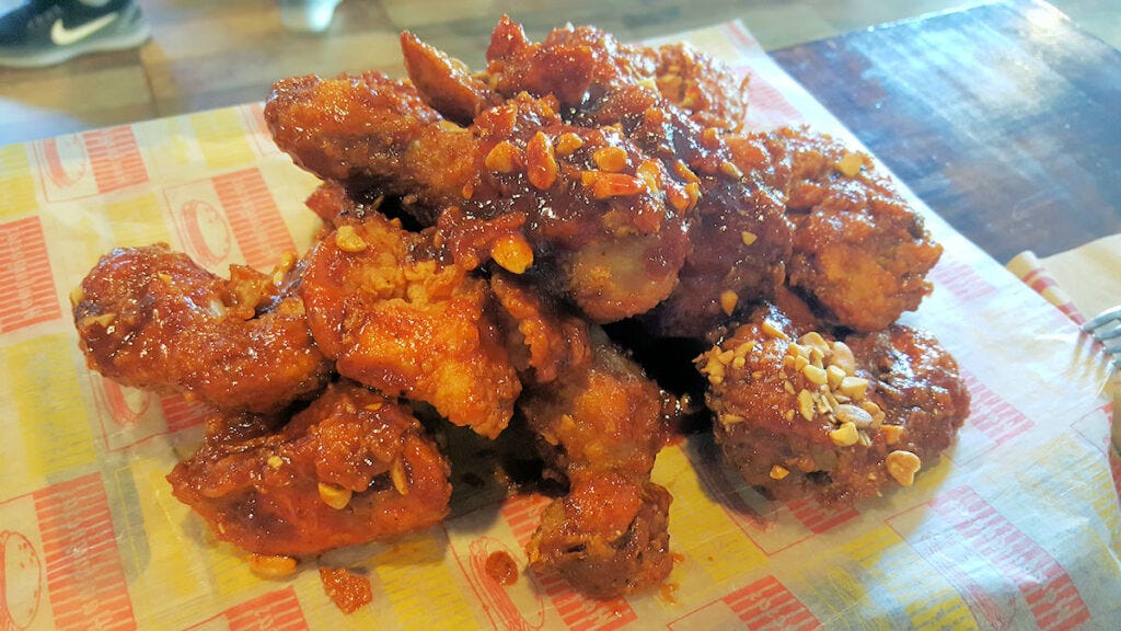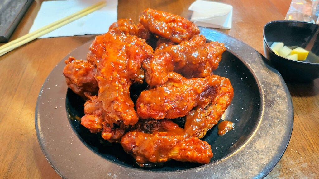 And, no arguments were made when we ordered the spicy fried chicken, nor was their any skimping on the spice. You get a dozen wing drumettes for 20,000 pesos, around $15. And absolutely delicious. Great crunchy batter, gloopy, sweet and spicy sauce, pickled daikon to cut through it all. Oh, and available plain, spicy, green onion, or garlic sauces. Next time, going to give the garlic a try, it's another favorite. And maybe try some of the other dishes on the menu - my recollection is that the first time I went there (I have been back, though not for about five years), there was little if anything on the menu other than the fried chicken offerings, and at the time, it might have been just plain or spicy (albeit they left the spicy part of the sauce out of mine).
