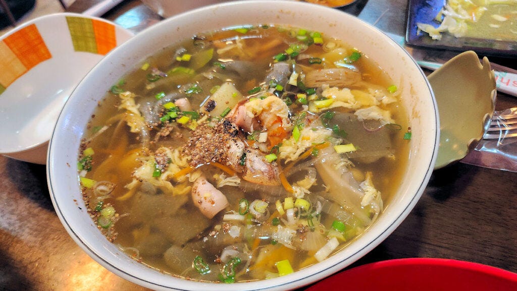 We got a bowl of sujebi, one of my favorite Korean soups - packed with hand-torn, not cut, noodles. Lots of mixed seafood, and just loaded with thick, chewy, ragged, yam-based noodles. One of the better versions I've had of this, and we drained it to the bottom. 9000 pesos, a little under $7.