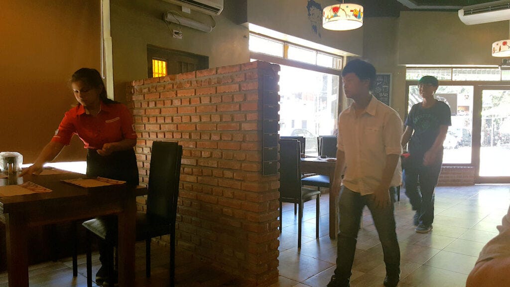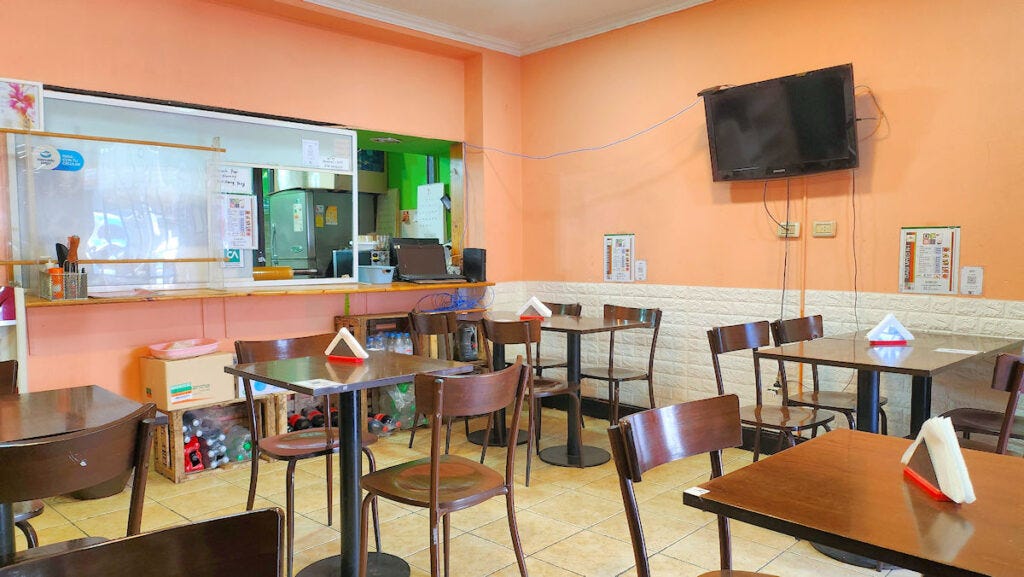 Bringing back the original photos from our first visit to Chicken the Pub, Balbastro 2105, Flores, just because I didn't take a new photo of the space on this visit. It's a bit cafeteria-ish, with an open kitchen along one wall. They have removed that brick divider wall - they closed up back in April for about a month and did some remodeling, and modernizing the kitchen to some extent.