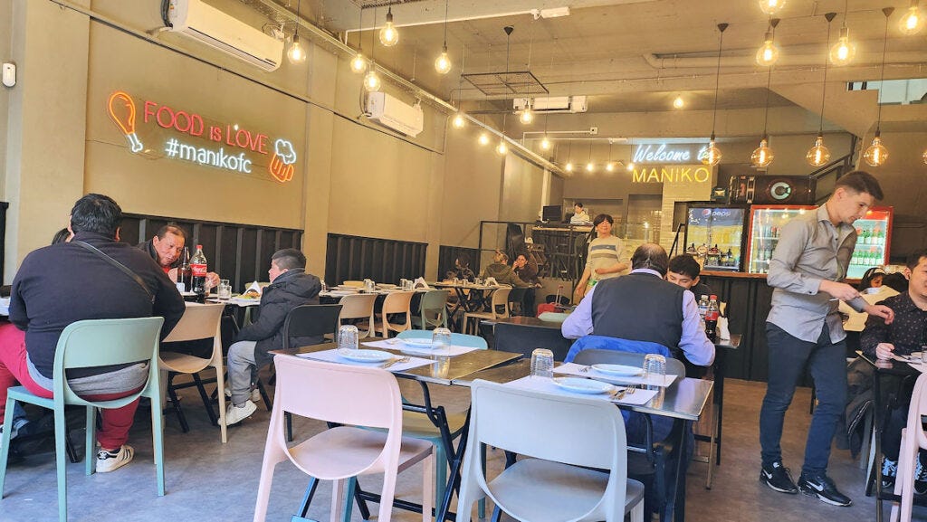 Maniko has moved around a bit. The first time we tried it was in Floresta, where they had a small, almost fast food style operation where they were serving up two-pound platters of boneless white meat fried chicken tossed in your choice of around a dozen different sauces. They later popped up in Palermo, where service and kitchen seemed inordinately slow - over a trio of visits - and then they closed up again. There, they offered a choice of the same boneless white meat, or wings, both in more individual portions. And, they cut the number of sauces down to five - barbecue, spicy, garlic, green onion, or soy (plus the option to get them sauceless). Now they're back in Floresta, taking over the space that was Azit, Ruperto Godoy 733.