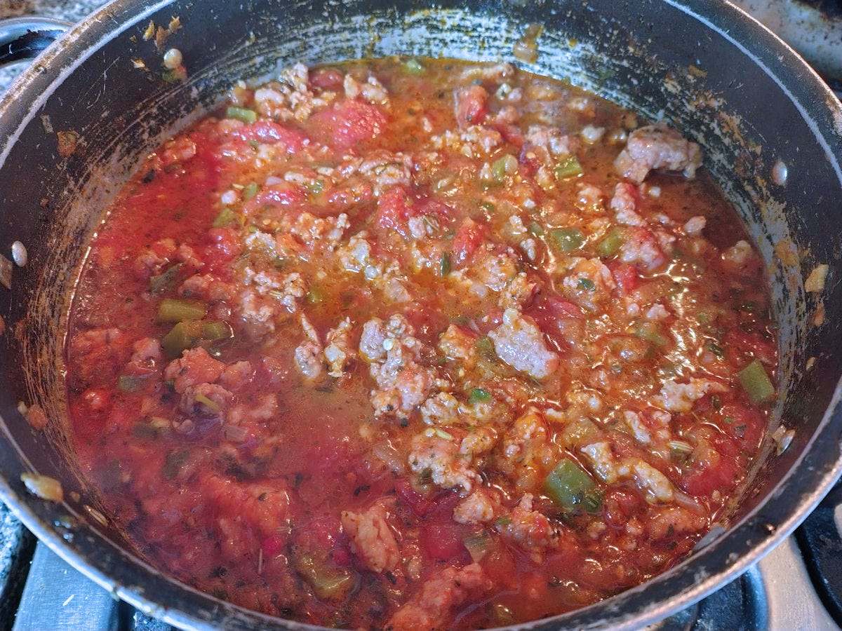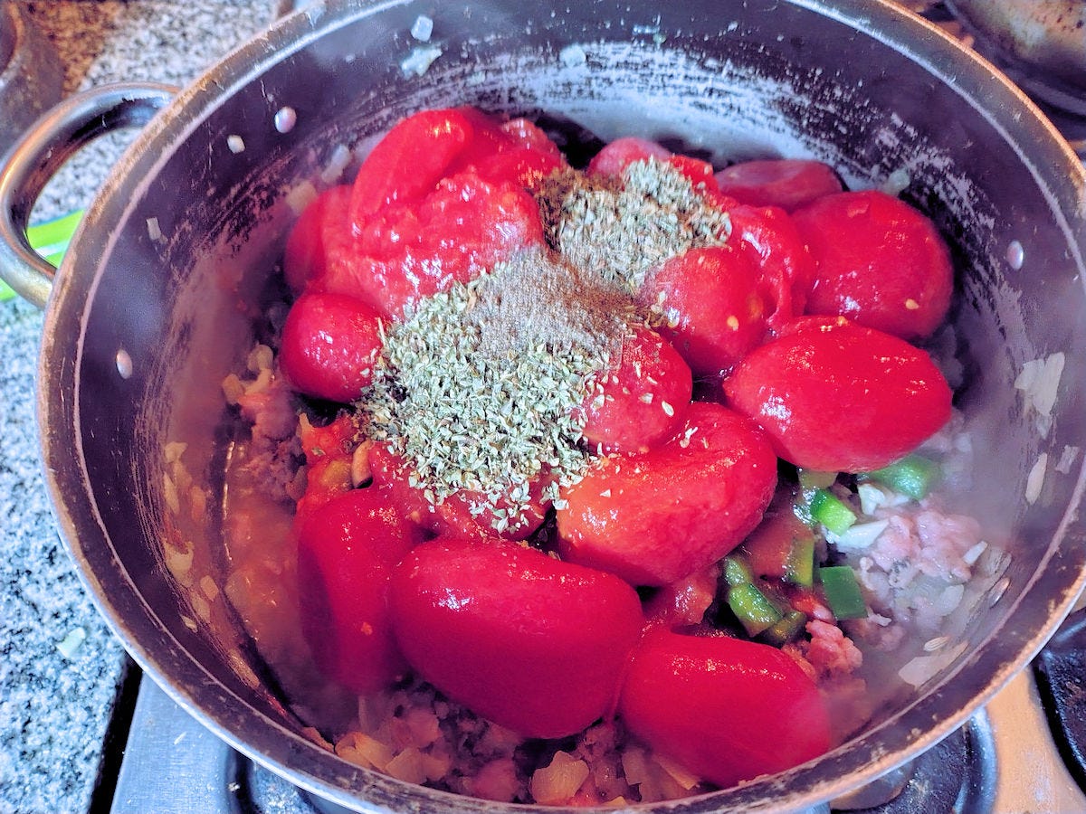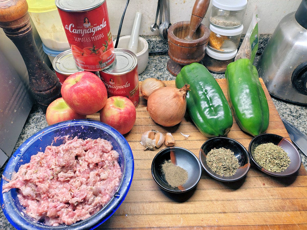 So we’ve got all the ingredients here: canned whole tomatoes, onion, green bell pepper, apples (not cider ones, as we don’t have those here), garlic, basil, oregano, Italian hot fennel sausage (I made my own mixture, as I’ve still not found anyone who makes a good Italian hot, or sweet, fennel sausage here), olive oil, and parsley. I was making this for a big group, and so the quantities are about 1½ times what’s specified on the paper. I added in some ground pepper, and although not pictured, salt.