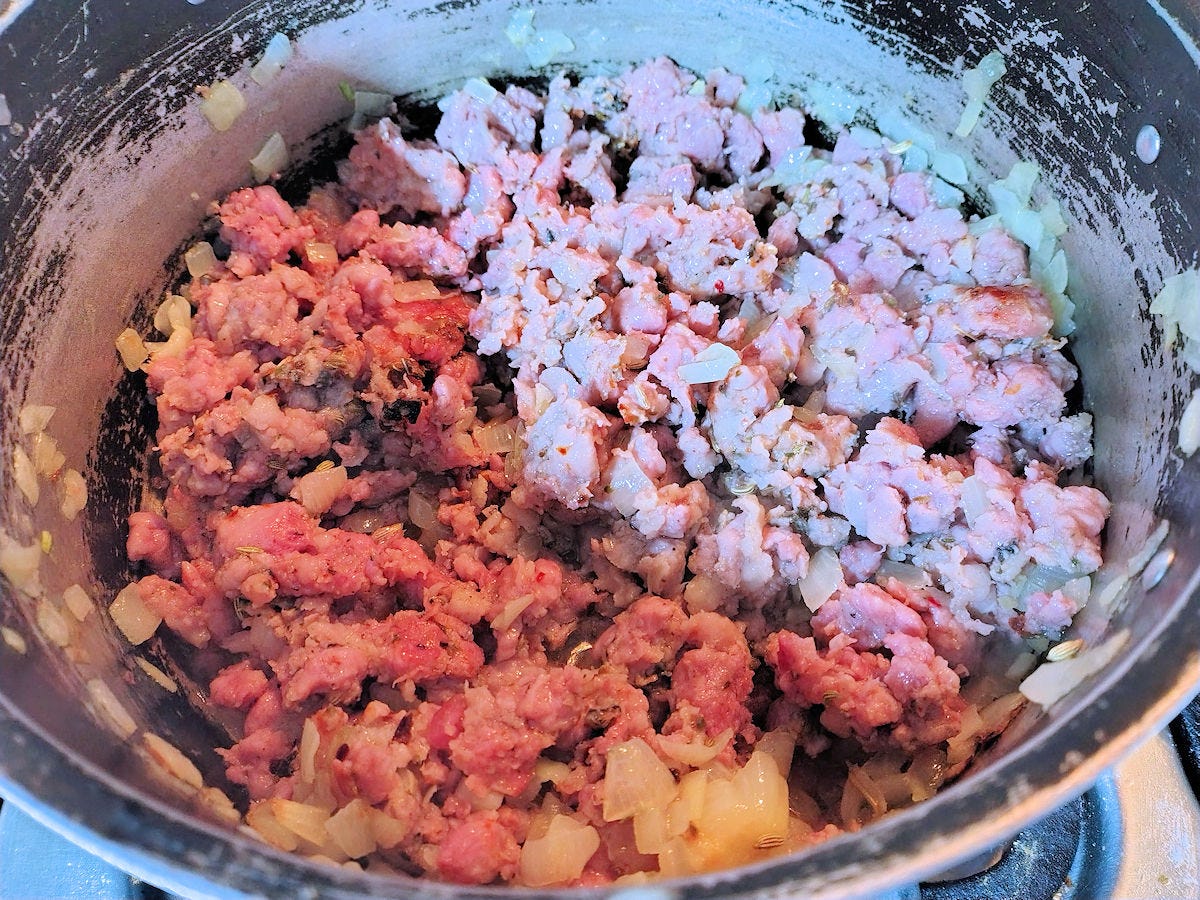 My Italian sausage: freshly ground pork shoulder and pork skin, mixed with a little pork fat, salt, pepper, chili flakes, aniseed, fennel seed, garlic, sage, and sugar.