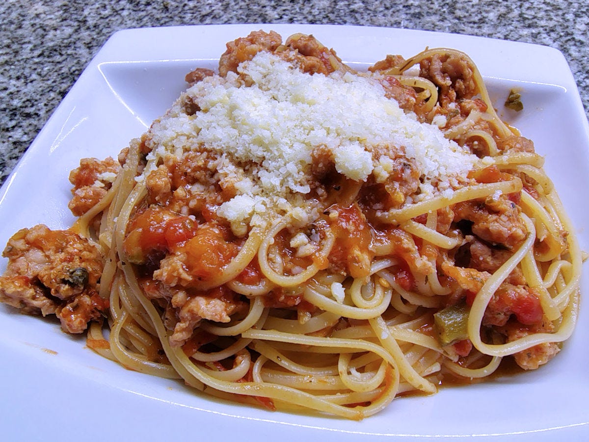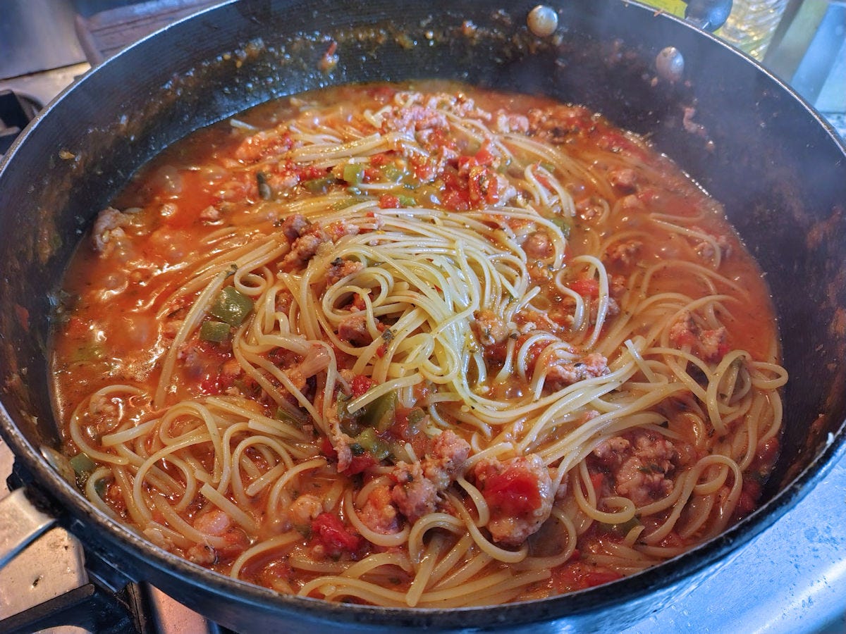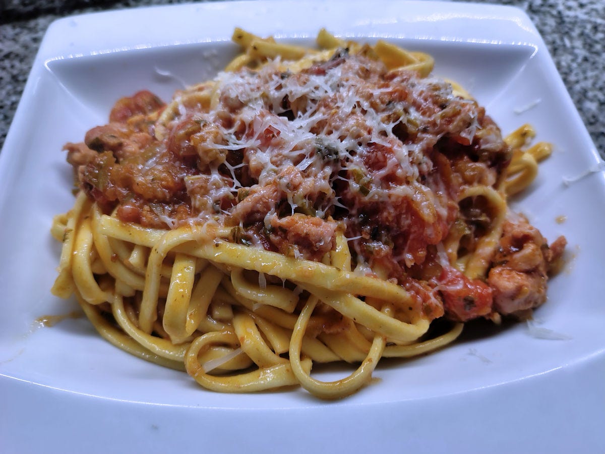 So what have I changed? I’ve cut back on the apples. It’s probably just the difference of not having cider apples, but the ones we have here just made the sauce too sweet. And as I said, I’ve left them with their skins on and just chopped them. I’ve replaced the dried basil and oregano with fresh. I just like the way the herbal notes come out better. I’ve also gone to using tagliatelle instead of spaghetti - this sauce just feels like it needs something with a little more heft to it. And, instead of finely grated parmigiano I’ve been using sheep’s milk pecorino, I just like the flavor better with this sauce.