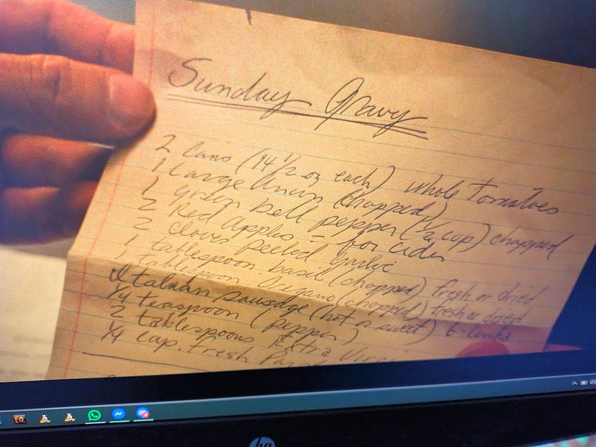 Spoiler alert - as is also so often the case, one day, in going through boxes of stuff in the attic or basement or wherever, Joe stumbles across his grandmother’s written recipe for the sauce, which, of course, was not just locked up in her head never to be shared. I, of course, replayed the scene and did a screen grab. You can’t see the whole recipe, and of course, there’s no evidence that this has anything to do with the real Joe’s granny’s recipe, or that it’s even a sensible recipe at all. It doesn’t mention salt and pepper - but then, one might say, oh, but everyone knows you add salt and pepper to recipes like this. Well, yes, but everyone also knows that you’re going to use a couple of tablespoons of olive oil to sauté things in, but that’s on the ingredient list. And was nonna really using cans of tomatoes? More likely, having been set in the 70s, and the type of family kitchen shown, she was using jars of tomatoes that she’d “put up” herself. In fact, I seem to recall seeing her using them in the opening scenes. And of course, the instructions part of the recipe isn’t shown, it’s below the hand-drawn line at the bottom of the picture.