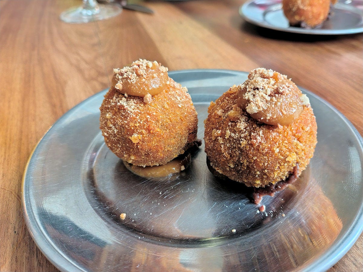 Surprisingly, the runaway favorite across the board is their duo of morcilla (blood sausage) croquettes. They’ve turned the sausage into, basically, a custard, encased it in breadcrumbs, deep fried it, and served it up with a pureed apple chutney. It goes up there in my pantheon for favorite blood sausage dishes over the years. And yes, I have a pantheon of blood sausage dishes. 10500 pesos.