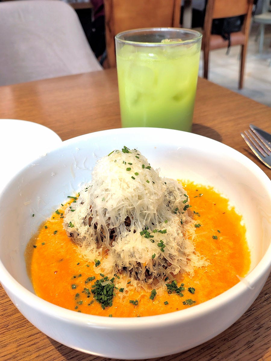 Meatballs, obviously, had to be tried. A quartet of them, deep-fried and crunchy on the outside, delicious and tender on the inside, piled high with grated cheese and served over a classic, creamy tomato “alla vodka” sauce. They are as excellent as the croquettes above, though 19000 pesos feels a bit steep for four meatballs the size of a walnut shell. That’s the Green Chef juice in the background.