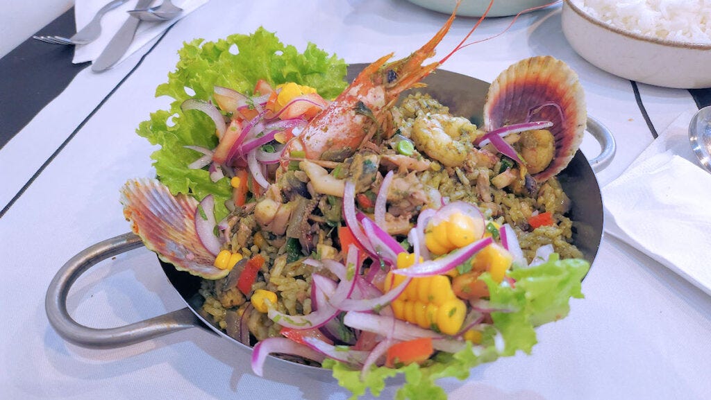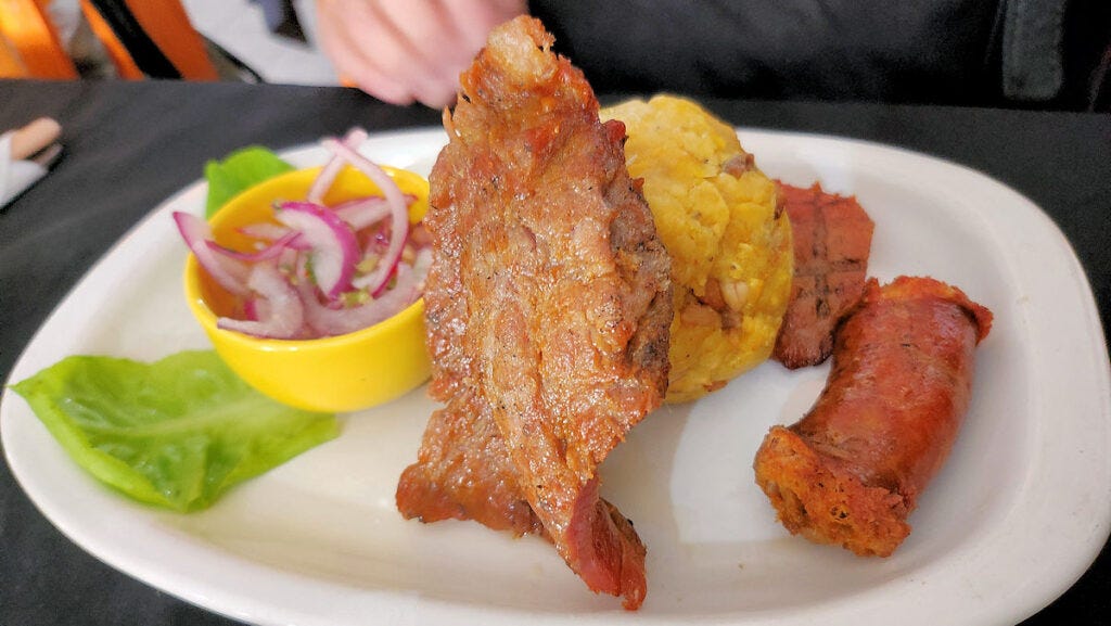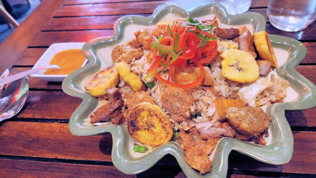 The "Amazon style" chaufa, or fried rice, is huge - easily enough for two. Anyone who watches "Uncle Roger" online knows that there are a lot of people out there who royally screw up making fried rice. These folks don't. This is one of the best I've had in town. And the well seasoned and perfectly cooked rice is studded and covered with slices of a traditional sausage from the Amazon, and cecina, the spiced and cured pork that is used in many dishes from the region, as well as chilies and fried plantains. I'd go back just for this dish. (12500 pesos, just under $13)