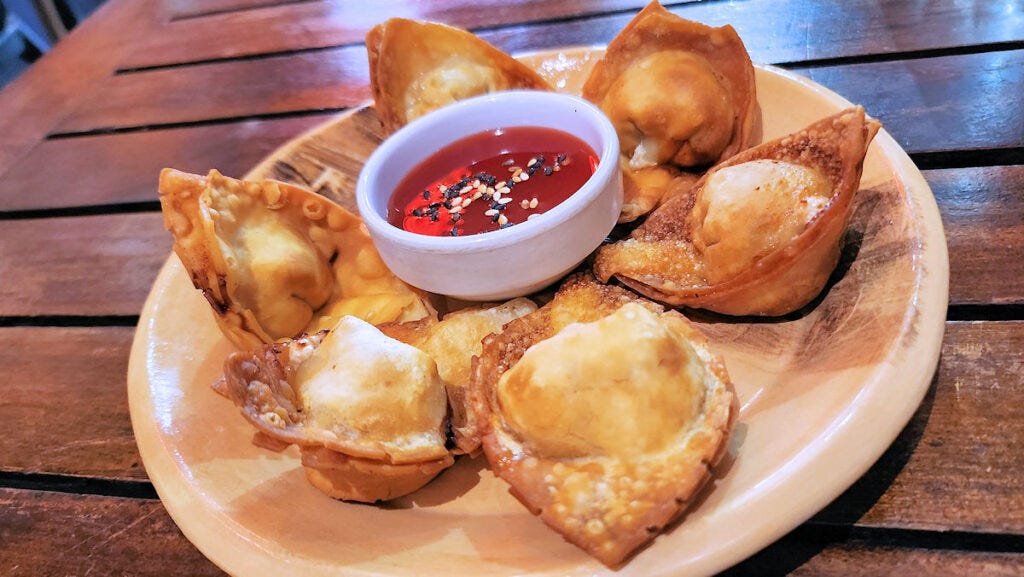 From the more Chinese side of the menu, I liked the sound of some crispy pork wontons. They come with a sweet and sour dipping sauce - something at least fresher and lighter than the common duck sauce. And, with some hot sauce brought on the side, the combination worked. And the wontons were well packed and flavorful. (8000 pesos, a little over $8)