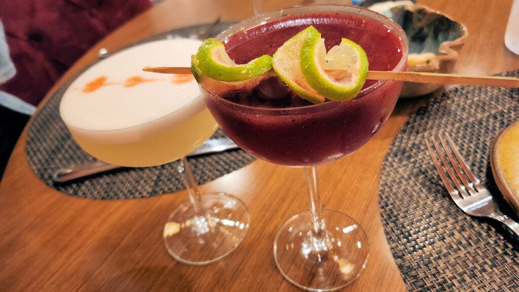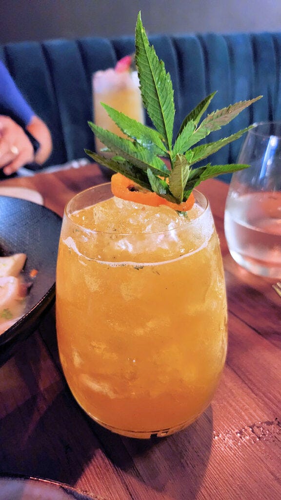 A round of creative and quite good cocktails. Leaning a bit sweeter than we both tend to go for, but not ridiculously so.