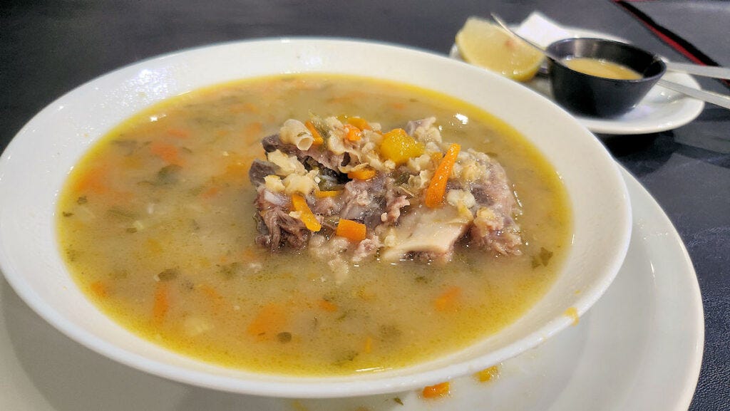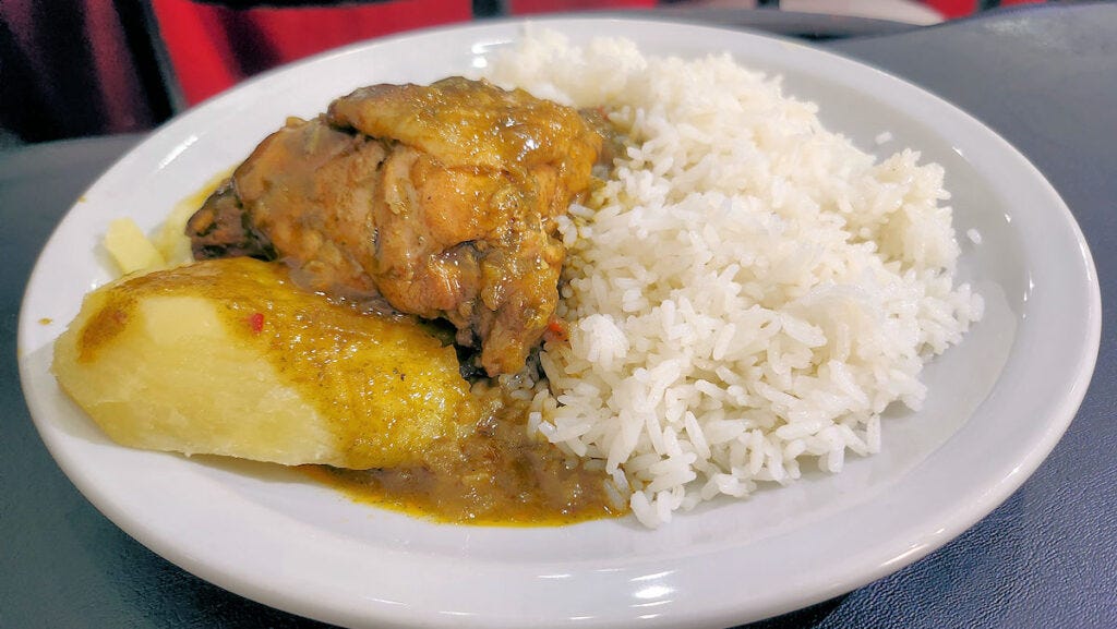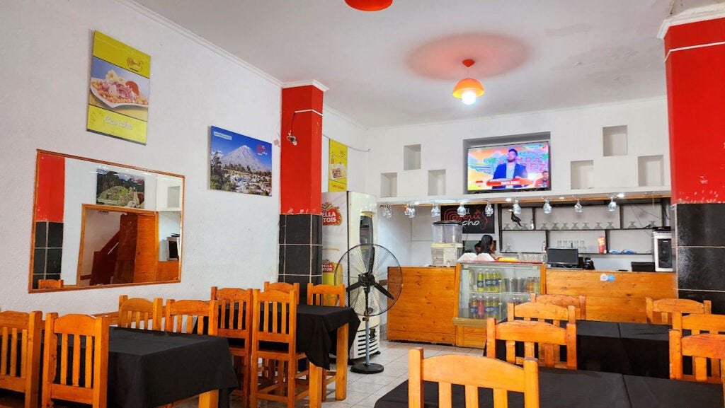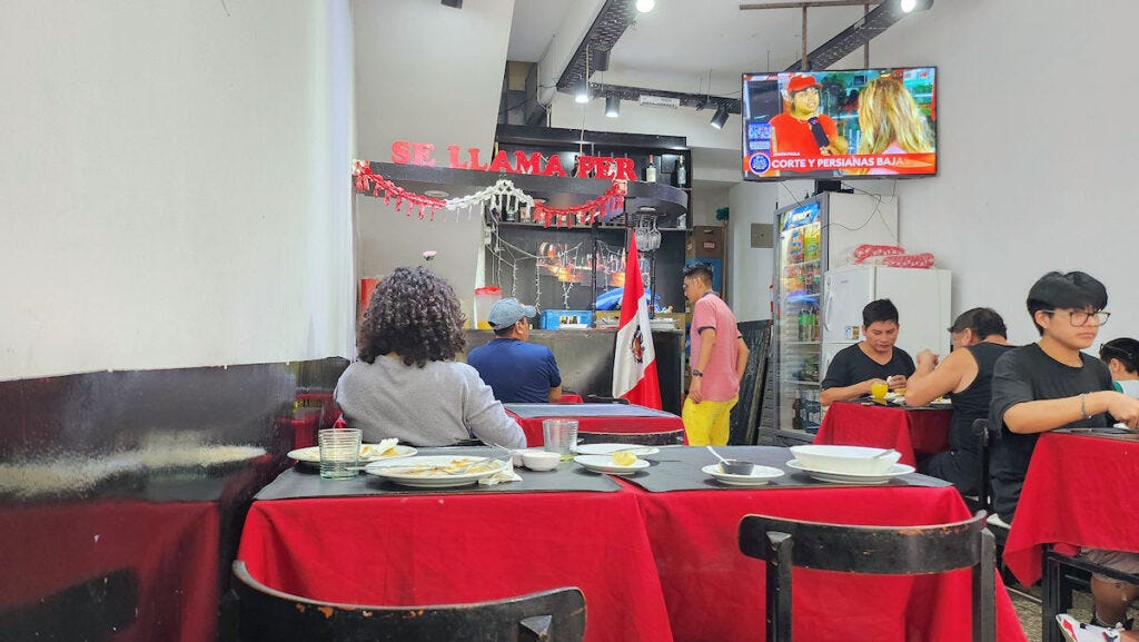 Given the lack of pleasantness, and the roll of eyes when I clearly violated the norm by thinking about ordering a la carte at lunch, I felt cornered into one of the two options for the daily menú. A watery, tasteless soup with no more than a few pieces of vegetable floating about, and piece of bone that had minimal meat on it. Tasted and ignored. I'd like to say the main course, a seco de pollo, fared better, and it did, but only because it was a low bar to surmount. Near flavorless sauce, an undercooked potato, and what seemed like probably day-old rice, just rewarmed. I kind of pushed it all around on the plate after eating a couple of bites, paid the bill (4000 pesos, or $4, so not a huge cost, and that included a beverage), and went elsewhere to eat. 'nuff said?