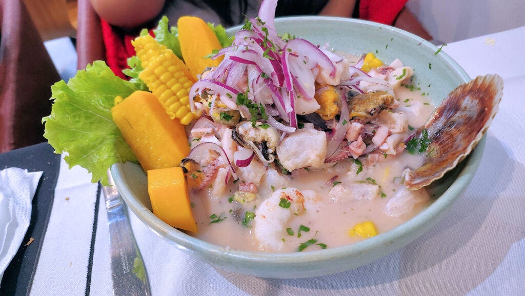 We shared a ceviche clásico, everything nicely in balance, everything fresh, and absolutely no "heat". Completely devoid of chili (and that's after being asked if we wanted it picante or not). A hot sauce brought to the table had little more than that, and a request for something hotter got us a refreshing and picante dish of chopped rocoto chilies, along with dire warnings from our waitress.