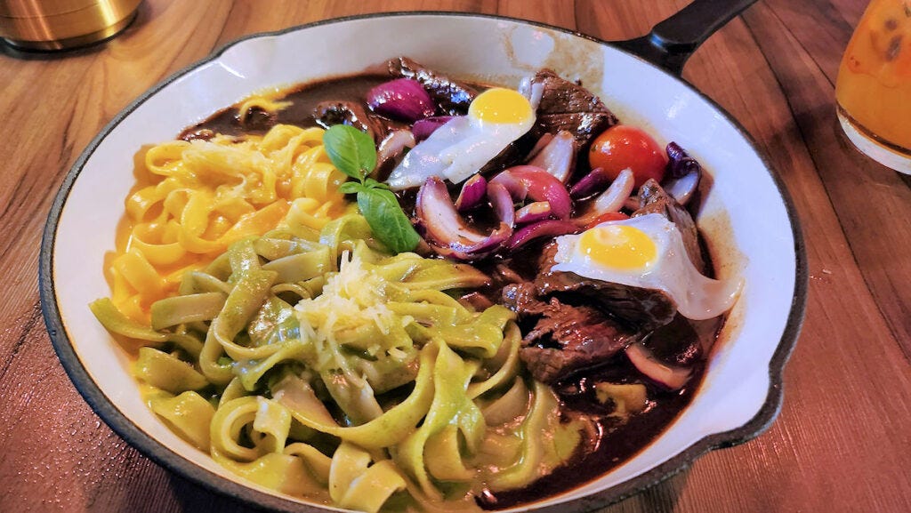 We were both in the mood for a lomo saltado, stir fried beef. Henry went classic, served with rice and potatoes; I went fusion with two preparations of pasta. They were both good, albeit a bit heavy on the soy sauce in the cooking liquid, and way too much of the liquid served, without thickening it up. The classic version could use more potatoes in it. The pasta version... meh. While the pasta itself was fine, the sauces were kind of indistinct and not what they promised to be. The yellow one was supposed to be huancaina - a cheese, yellow chili, and walnut sauce - this, as best I could tell, was just a cream sauce with maybe a little yellow chili added to it. Meanwhile the genovesa sauce was not genovesa sauce, which is an actual thing, a sort of slow cooked meat and onion gravy, this was more genoa related, maybe a play on pesto - a cream sauce with a little basil and garlic in it. The two quail eggs added nothing but visuals to the dish.
