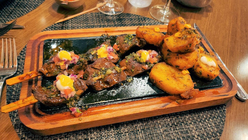 Pretty much the same on main courses. Both a platter of anticuhos and a seco de cordero, two favorites, were well cooked, well seasoned, nicely presented, and again, completely devoid of chilies as best we could tell. More rocotos needed and provided....
