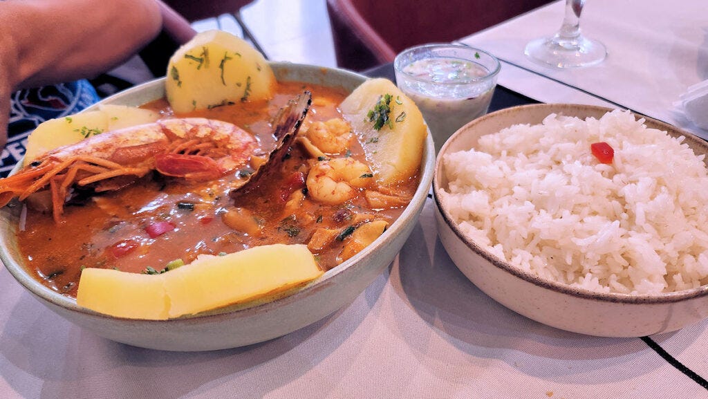Henry loves sudado, though he generally prefers a fish only version, he happily ate all but the head-on prawn. I get to eat those.
