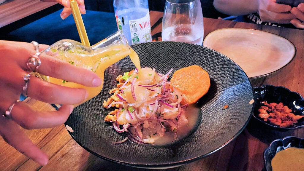We shared a ceviche clásico again. They still do that last minute cured thing, more like sashimi. So we simply mashed it all into the leche de tigre and sat back and enjoyed our cocktails for about 15 minutes before we started eating. I get the theater of the whole thing, but ceviche isn't raw fish, it's cured fish, and if you're going to serve it and call it ceviche, cure it. You could even semi-cure it in advance and then still make a show of pouring the leche over it.