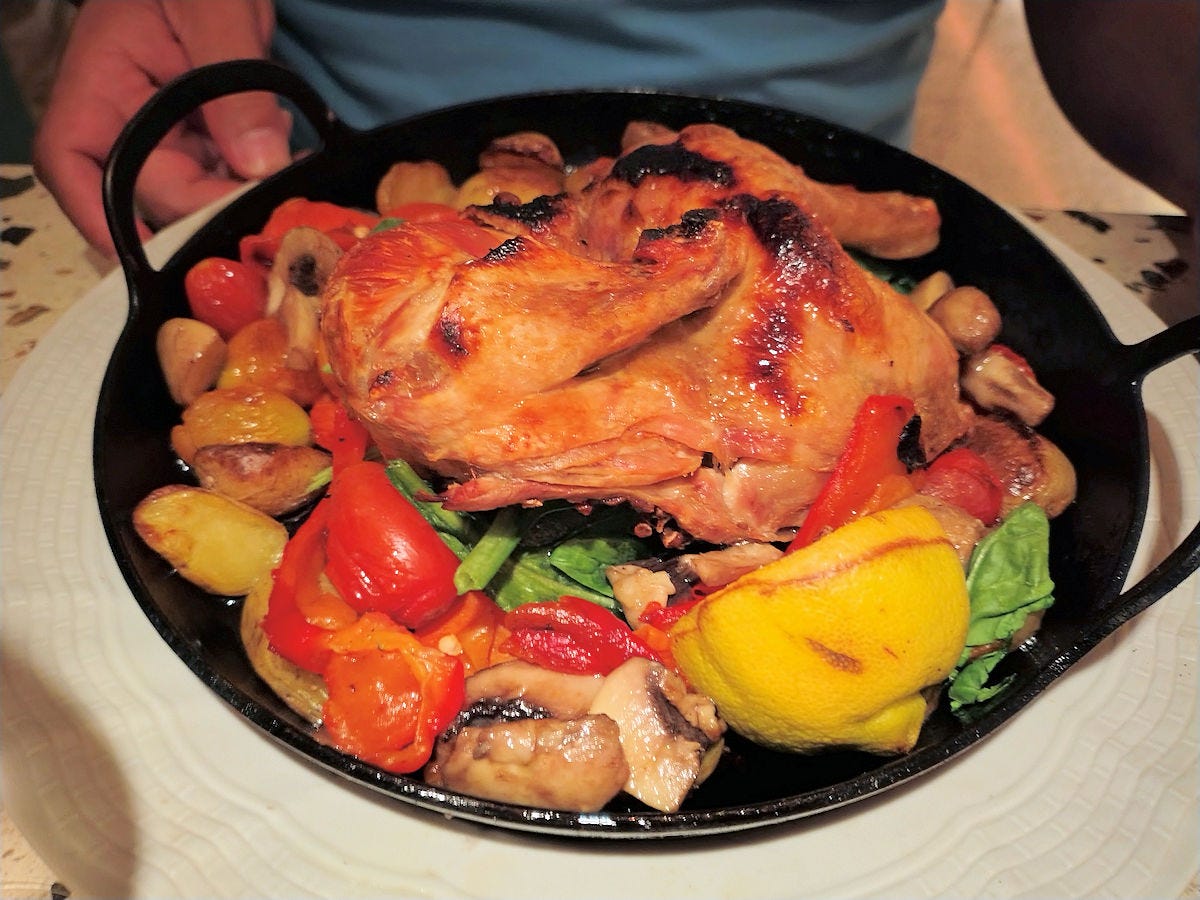 A half of a roasted pollito, or baby chicken. With its roasted vegetables this is easily a platter for two, if not three. We brought it home and split what was left for lunch. 40000 pesos.