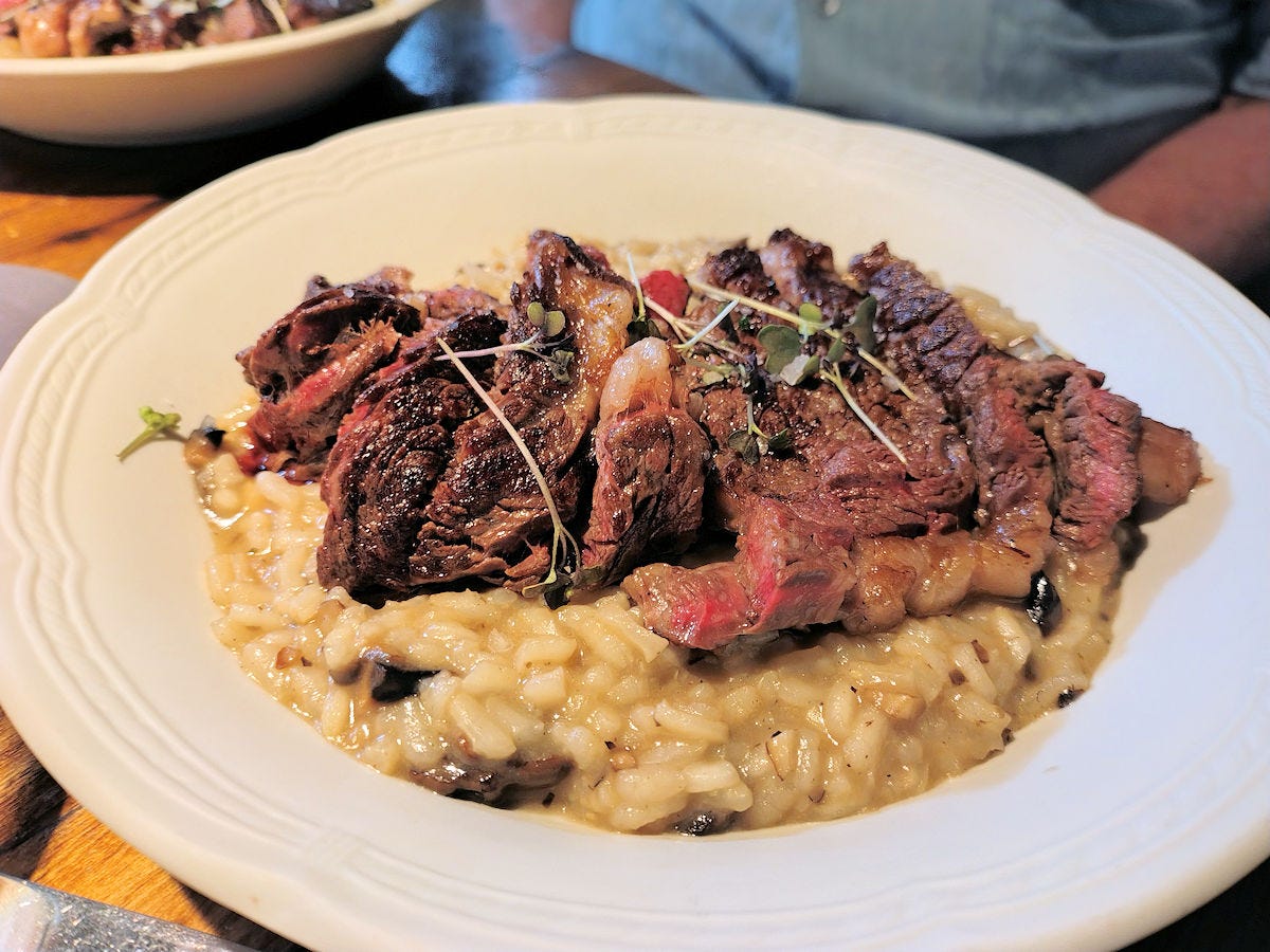 Steak, cooked a proper medium rare, and, if I recall, a ribeye, though I’m not sure, and it was part of the day’s menú ejecutivo (depending on how many courses, either 26000 or 30000 pesos) rather than a regular menu item. Served over a proper mushroom risotto. Given that that price includes an appetizer or dessert, or both, plus beverage, it’s a fantastic deal.