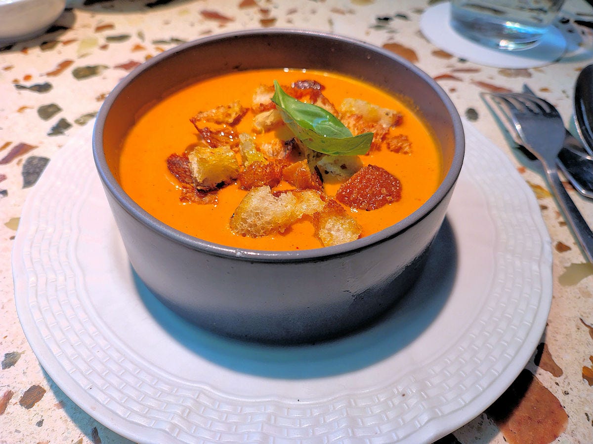 Service is well coordinated, with everyone on the floor being connected by radio, and messages clearly get to where they’re intended to get, with one or another waitperson handling something we asked of a different staff member, often within seconds. The kitchen is semi-open, at the back of the main floor. There are also a few seats at the bar on that level, which I’d probably opt for in the future if dining solo. Let’s check out the food!