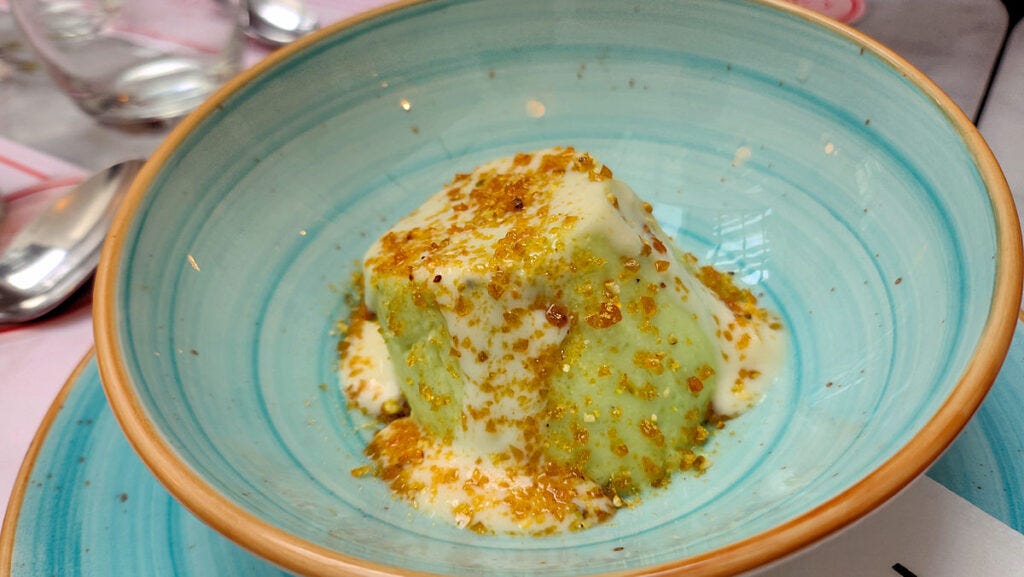 And a surprising and amazing pistachio pannacotta with a white chocolate creme anglais and crushed pistachio praline. 7700 pesos.