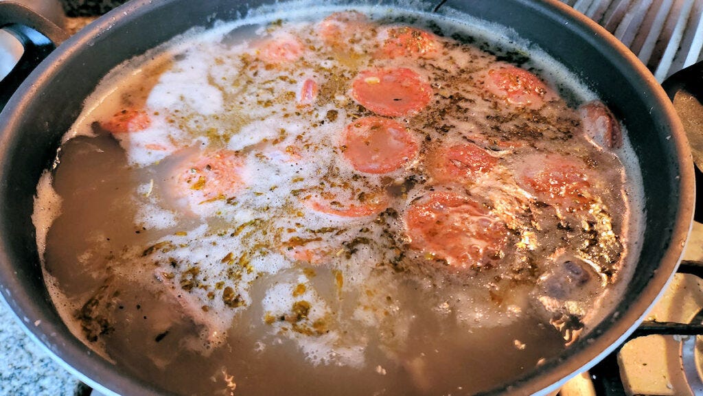 Add the meats, the oregano, and some salt and pepper. Bring back to a boil, turn the heat down to minimum, cover, and simmer for 90 minutes.