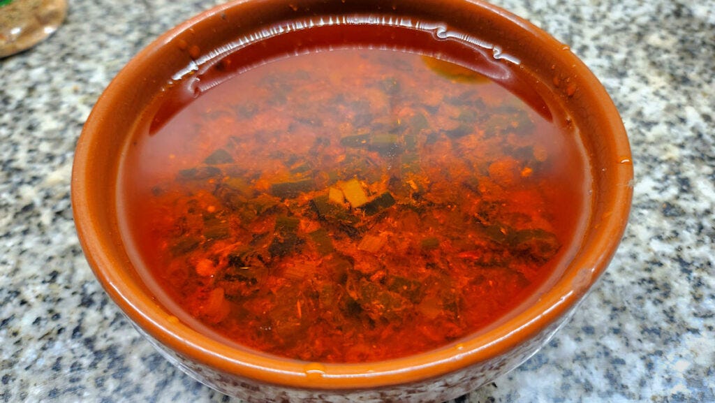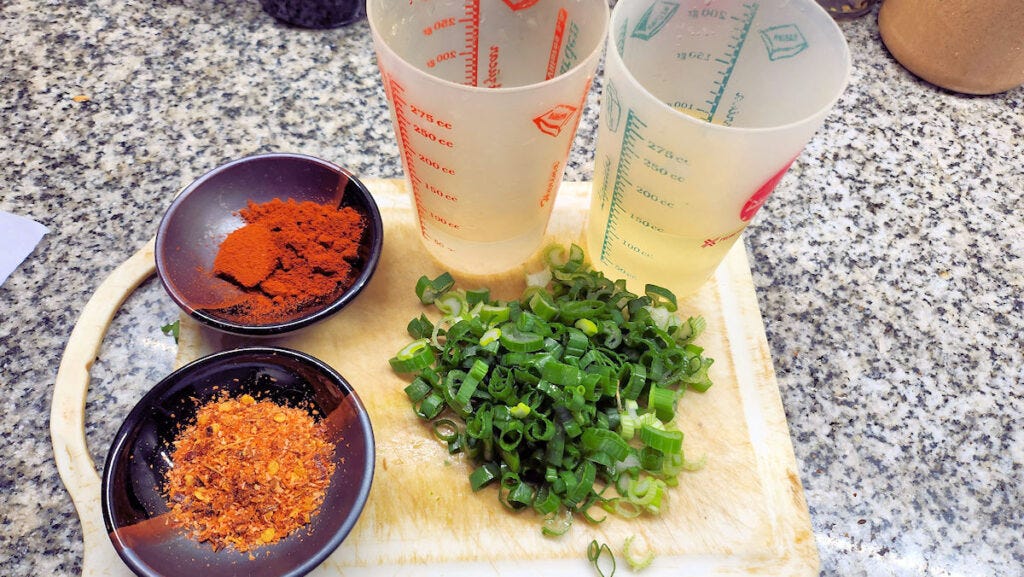 Now, on the side, during that 90 minutes of simmering, we're going to make a typical "hot sauce" from the Corrientes region. They're big on green onions up there. Here we have a couple of green onions chopped, a couple of teaspoons of chili flakes, one of hot paprika, 120 ml (1/2 cup) of neutral vegetable oil, and 60 ml (1/4 cup) of cold water.